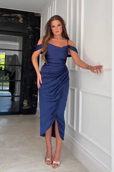 Val op in onze ‘Kamila marine-jurk ‘met off-shoulder en flatterende plooien over de heup. Maak het af met accessoires en hakken.