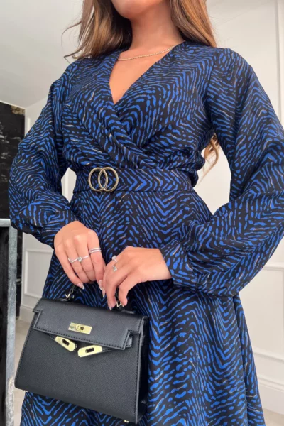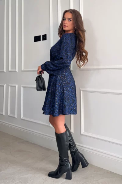 Maak je klaar om je garderobe op te fleuren met de Kammy Skater Mini-jurk met lange mouwen. Deze leuke jurk heeft een blauwe zebraprint ingelegd met gouden glitterdetails, een gesp, een skaterrok en een flatterende overslag aan de voorkant. Lange mouwen maken hem perfect voor koude dagen, en de opvallende print voegt een vleugje persoonlijkheid toe aan elk ensemble. Combineer hem met hakken of sneakers om de look compleet te maken. Het model draagt een 36 en is 1,80 meter lang. Voeg 5 cm toe voor elke maat groter in de breedte en 1 cm per maat voor de lengte.