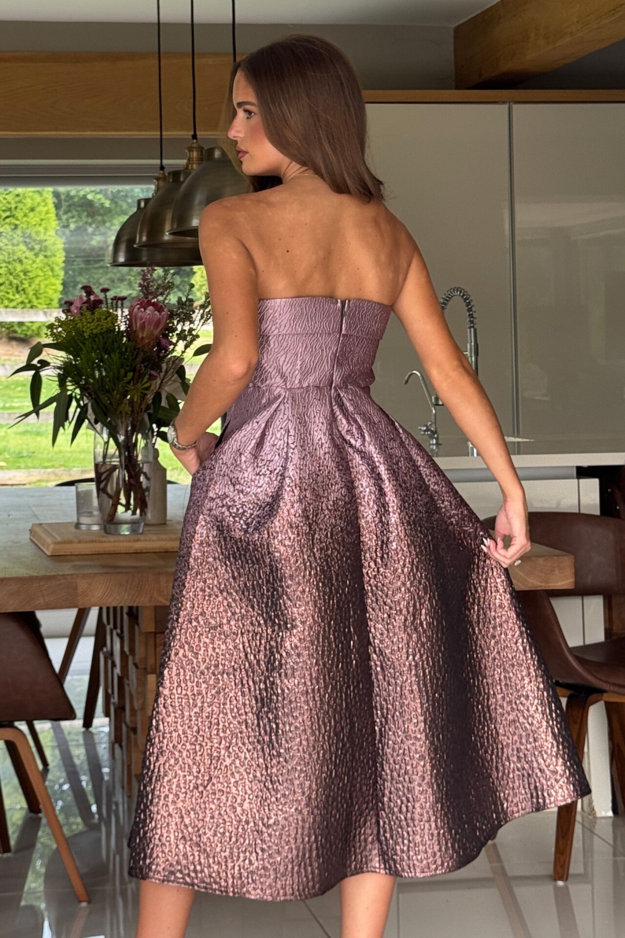 Maak kennis met Kanny – de jurk die elke gelegenheid onvergetelijk maakt. Gemaakt van luxe jacquardstof die moeiteloos meebeweegt met je lichaam, straalt ze stijl en zelfvertrouwen uit. De flatterende taille en zwierige midi-rok creëren een vrouwelijke, moderne look die altijd in beweging blijft.
