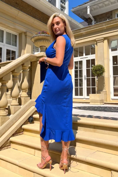 Wij introduceren onze ‘Kendrix’ asymmetrische midi-jurk met overslag en elegante ruches. De asymmetrische zoom is perfect uitgebalanceerd met een levendig blauw accent dat deze stijl net dat beetje extra geeft. Geschikt voor elke gelegenheid, combineer met hakken met bandjes voor de ultieme look deze zomer!