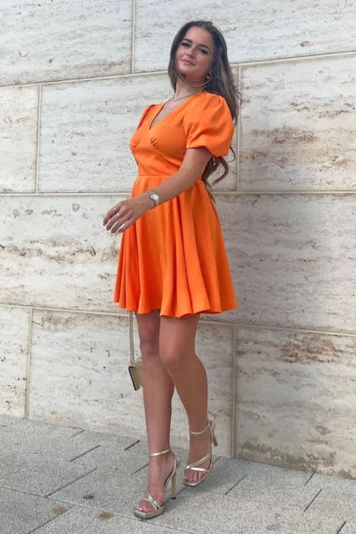 Deze oranje mini jurk is een opvallend en elegant kledingstuk, perfect voor zomerse gelegenheden. De jurk heeft een flatterende A-lijn pasvorm en een V-hals, wat zorgt voor een stijlvolle uitstraling. De korte pofmouwen voegen een speelse touch toe, terwijl de hoogwaardige materialen comfort en duurzaamheid bieden. Combineer deze jurk met hakken en een clutch voor een complete en modieuze look. Verkrijgbaar in meerdere maten, zodat elke vrouw kan stralen in deze prachtige jurk.