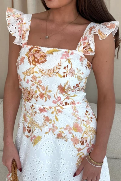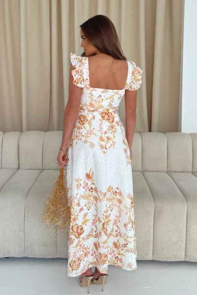 Let op: elke print is uniek en de bloemenplaatsing kan per jurk verschillen.