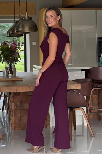 De asymmetrische halslijn zorgt voor een stijlvolle eyecatcher, terwijl de elegante wide leg-broek je figuur flatteert en je benen optisch verlengt. Een look die moeiteloos chic is – en nooit uit de mode raakt.