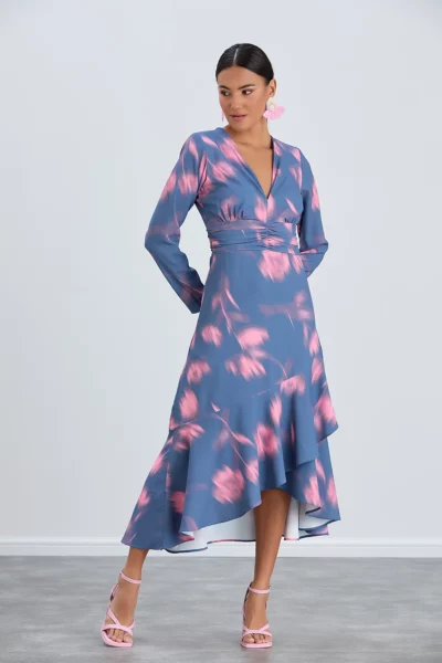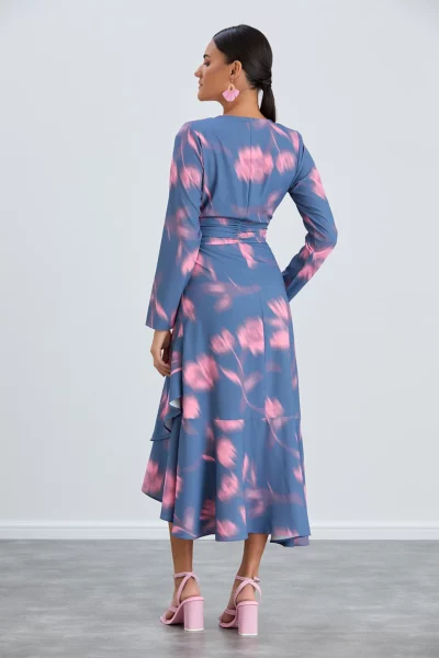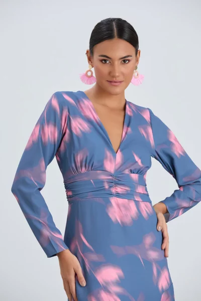 Deze prachtige jurk heeft een prachtige combinatie van blauwe en roze bloemenpatronen, perfect om een ​​statement te maken. De uitsnede met V-hals voegt een vleugje elegantie toe, terwijl de ruches een speelse en vrouwelijke look weergeven.