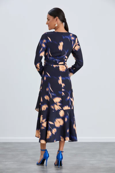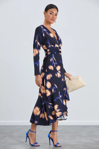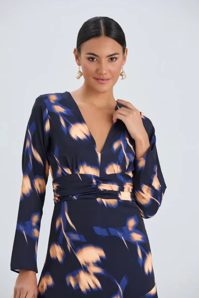 Deze jurk heeft een charmante mix van marineblauwe en oranje bloemenpatronen, waardoor het een opvallend kledingstuk is. De uitsnede met de V-hals voegt een vleugje verfijning toe, terwijl de ruches een speelse en vrouwelijke flair uitstralen.
