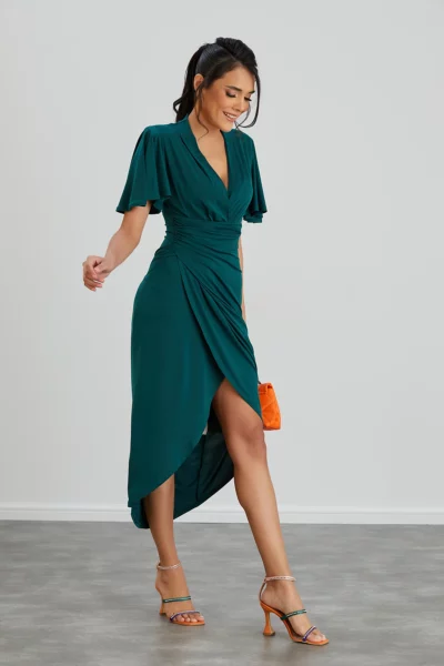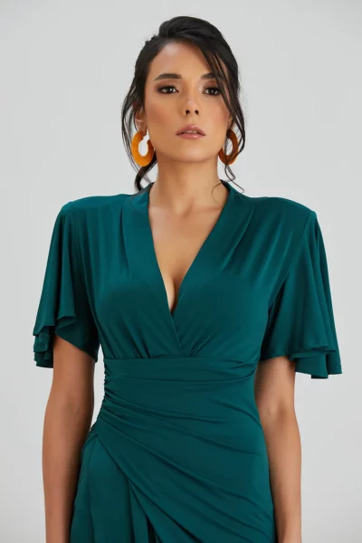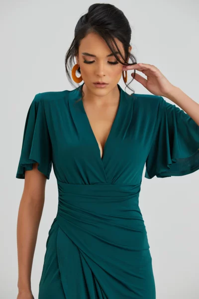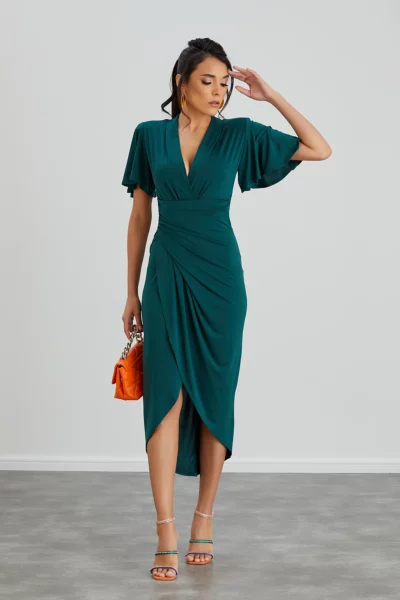 Straal elegantie uit in deze smaakvolle smaragdgroene midi-jurk. De diepe V-hals en gedrapeerde snit accentueren je figuur op een subtiele manier. Flatterende vlindermouwen en een asymmetrische zoom voegen een vleugje drama toe. Perfect voor cocktailparty’s of chique diners. Combineer met opvallende accessoires voor een onvergetelijke look. Deze veelzijdige jurk is een must-have voor elke garderobe!