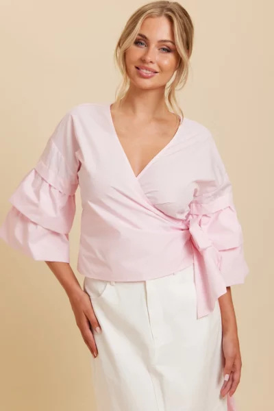 Deze enige echte wikkelblouse heeft een elegant wikkelsilhouet, driekwartmouwen met ruches en een strikdetail in de taille.·