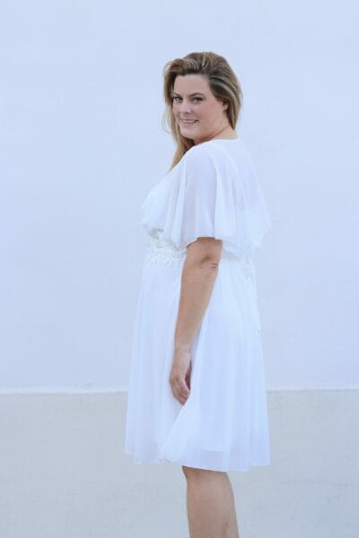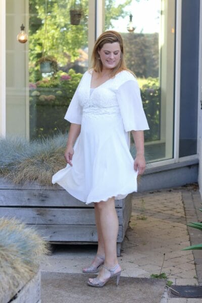 Deze jurk is een TU+. Ze gaat van maat 42 tot 48.